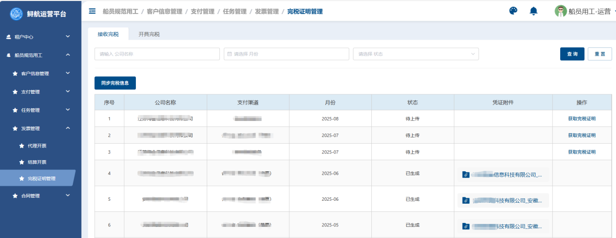 發票流方面和(或)為船員進行代辦申報,平臺要能夠確保基于真實業務數據向船企開具增值稅專用發票/和(或)為船員進行代辦申報,實現“業務-資金-發票(憑證)-納稅”的數據閉環。