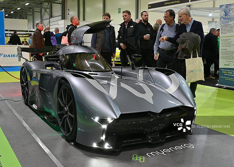 在英國(guó)倫敦范堡羅國(guó)際車展上,參觀者在觀看McMurtrySpeirling電動(dòng)超跑。