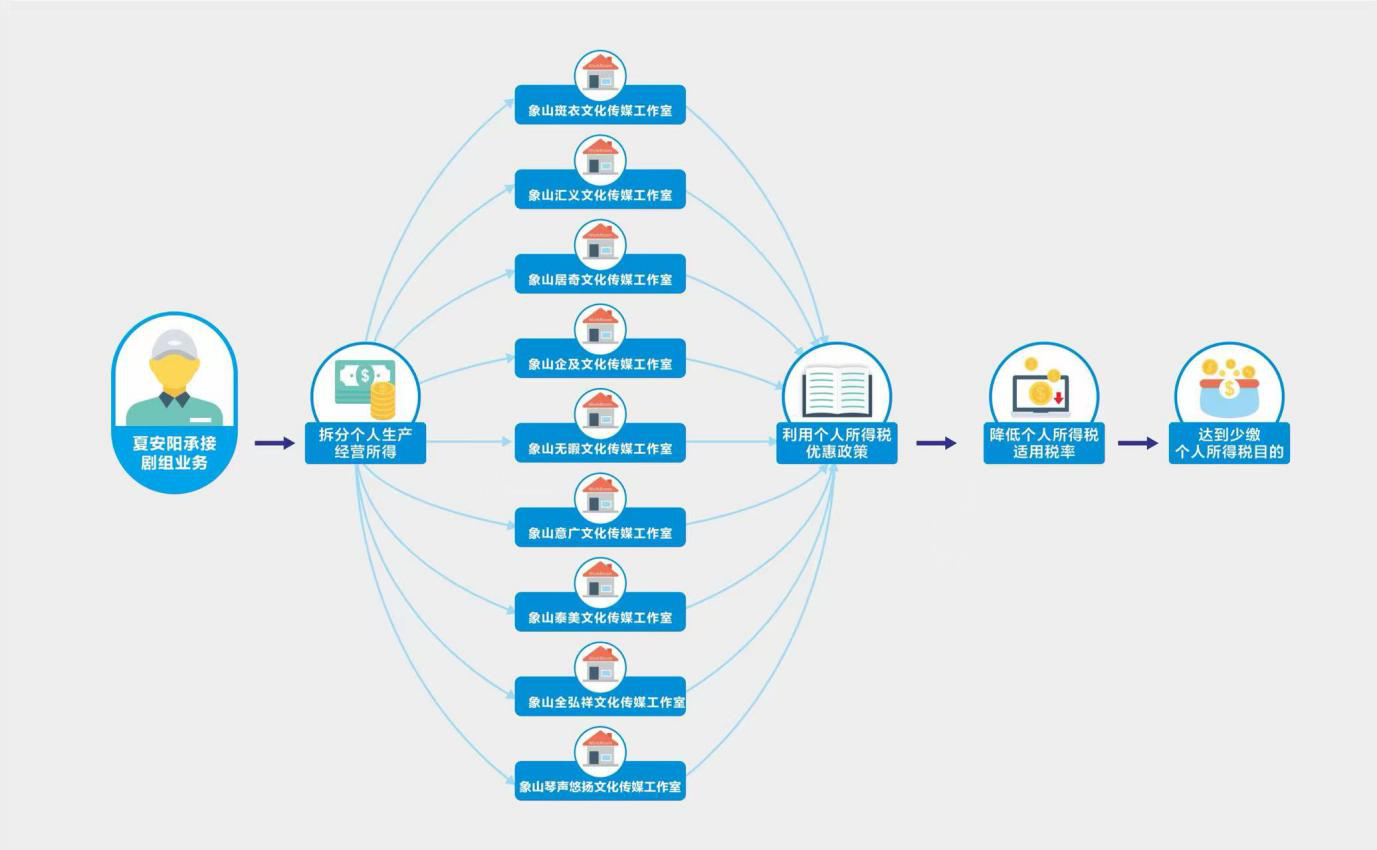 經核查,夏安陽通過控制象山斑衣文化傳媒工作室等9戶個體工商戶拆分收入少繳個人所得稅稅款345.92萬元。