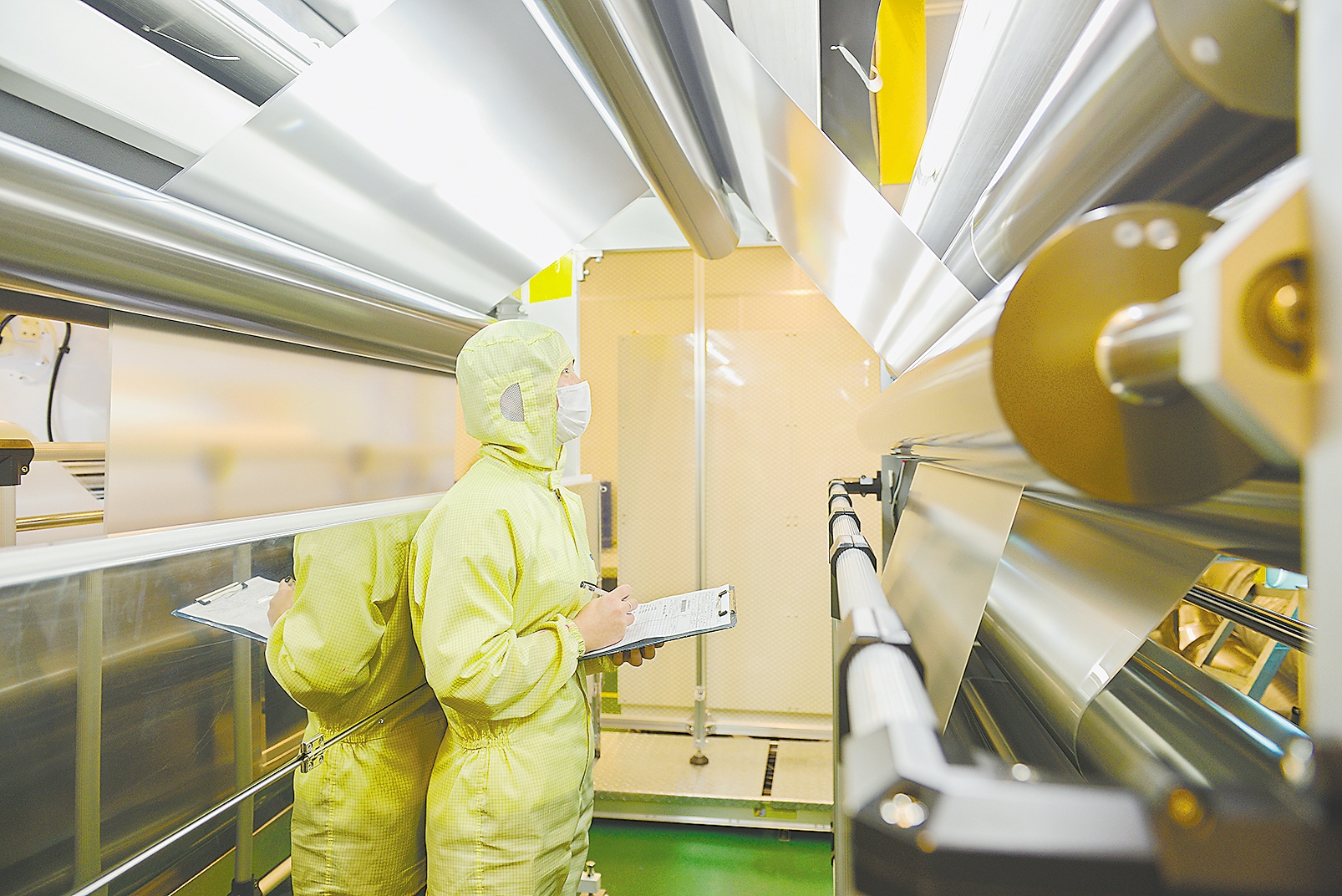 圖為激智科技工人在光學薄膜生產車間認真比對每一個數據。