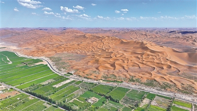 “三北”工程實施以來,新疆人工綠洲面積不斷擴大,由30年前的6.5萬平方公里增至目前的10萬平方公里,筑起了一道抵御風沙、保持水土、護農促牧的綠色長城,給各族群眾帶來綠色和幸福。圖為新疆鄯善縣庫木塔格沙漠邊緣的防護林。