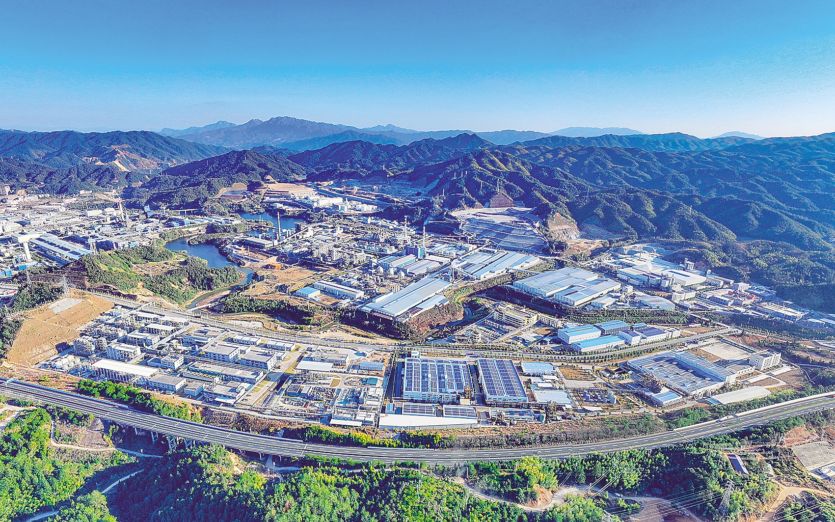 在蛟洋新材料產(chǎn)業(yè)園,構(gòu)成上下游聯(lián)系的企業(yè)有50多家。這些相互關(guān)聯(lián)的企業(yè)形成了環(huán)環(huán)相扣的循環(huán)經(jīng)濟(jì)產(chǎn)業(yè)鏈,在資源利用上實(shí)現(xiàn)了“吃干榨凈”、變廢為寶。圖為蛟洋新材料產(chǎn)業(yè)園全景。