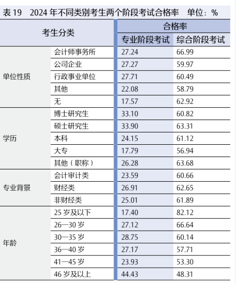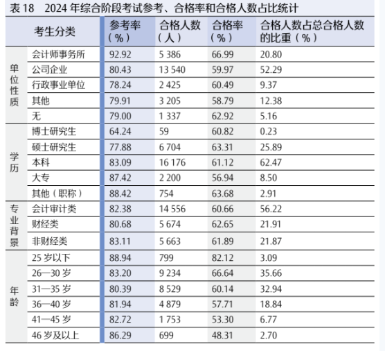 通過對2024年取得綜合階段考試合格考生的單位性質、學歷、年齡等分析,發現其合格結果與考試的職業導向高度相關,表現為:來自會計師事務所的考生參考率與合格率都最高;來自公司企業的考生合格人數占總合格人數的比重最高;具有本科學歷的考生合格人數占總合格人數的比重明顯高于其他學歷類別的考生;會計審計類專業的考生合格人數占總合格人數的比重超過50%;25歲以下考生的合格率最高,26—35歲考生的合格人數明顯高于其他年齡段的考生。詳見表18。