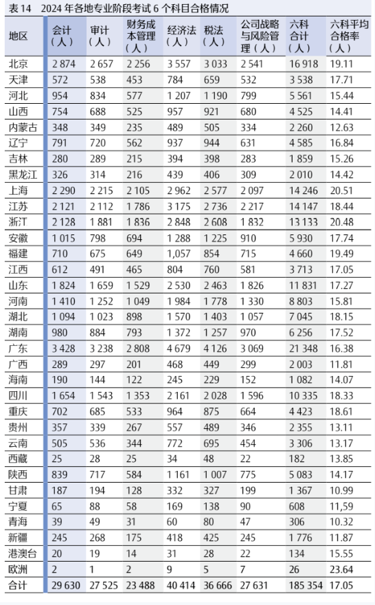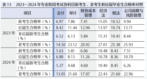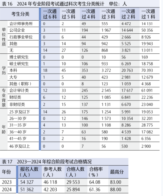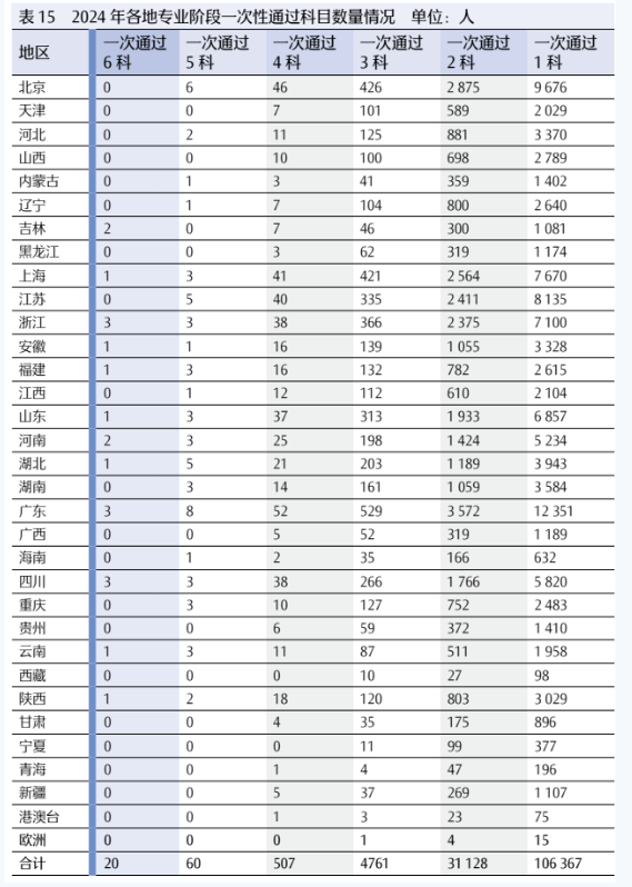 1.專業階段考試。2024年,有20人一次性通過專業階段考試;有14.28萬人取得至少1個科目的合格成績,總的合格科次達到18.54萬科次;有2.33萬人通過專業階段考試,取得報考下一年綜合階段考試的資格。6個科目的平均合格率為17.05%。老考生各科目合格率均高于新考生合格率,且高于各科目整體合格率。見表11、圖4和表12—16。