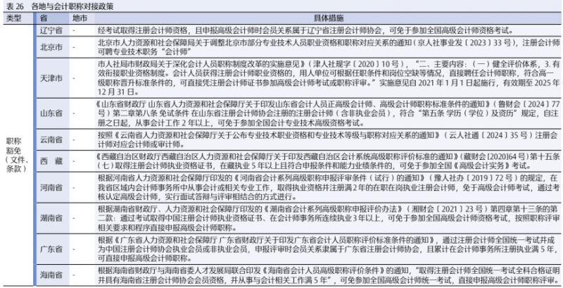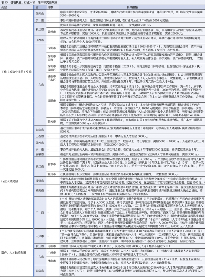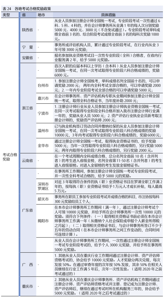 為吸引激勵更多優秀的專業人才加入行業,助力行業高質量發展,各省(自治區、直轄市)紛紛實行了不同形式的考試合格獎勵政策,包括執業獎勵、人才獎勵、落戶、人才扶持,以及與會計職稱對接政策等。詳見表24—26。