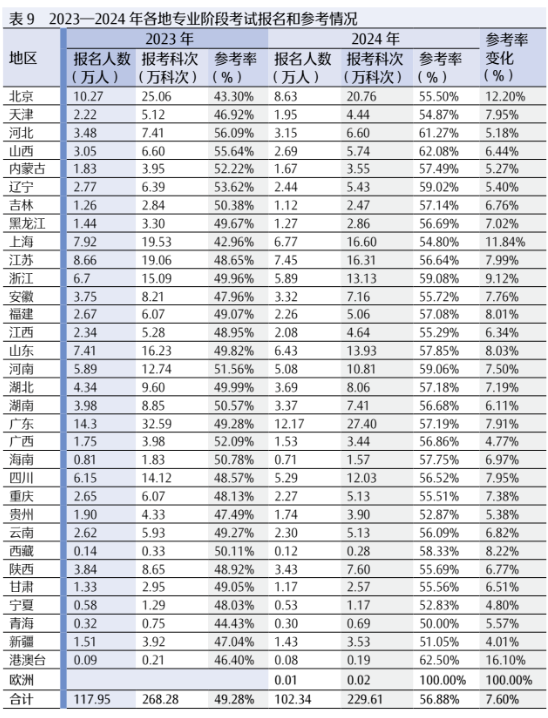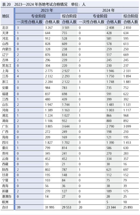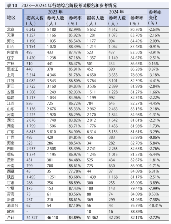 2.綜合階段考試整體規模略有下降。2024年最終通過資格審核并完成交費的人數有5.14萬人,較2023年減少了5.34%。詳見表6。