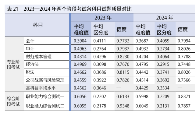 2024年專業階段考試6個科目整體的區分度為0.3534,各科目試題的平均區分度介于0.27~0.41之間。綜合階段考試區分度低于專業階段考試,但在可接受范圍內,其中職業能力綜合測試一的區分度值為0.2209,職業能力綜合測試二的區分度值為0.2131。