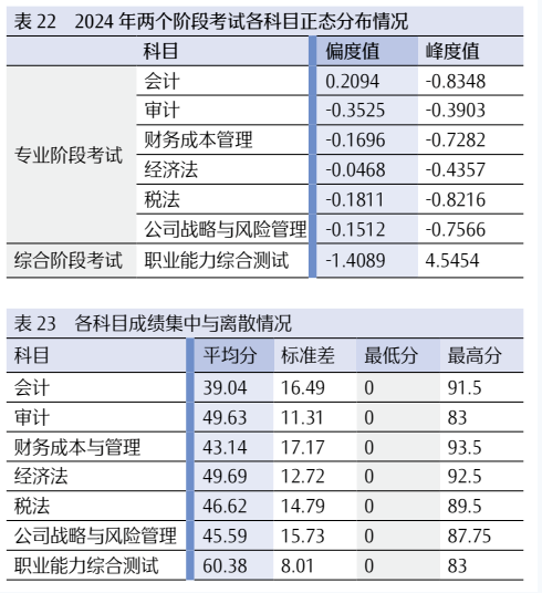 2024年專業階段考試5個科目的偏度值小于0,呈負偏態,說明高于平均分的考生人數比低于平均分的考生人數多;會計科目的偏度值大于0,呈正偏態,說明高于平均分的考生人數比低于平均分的考生人數少。專業階段6個科目的峰度與偏度值在-1和+1之間,說明考生成績呈現比較合理的正態分布。