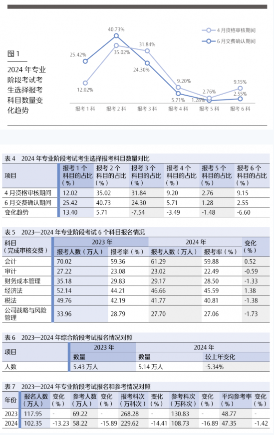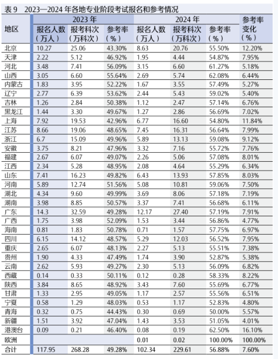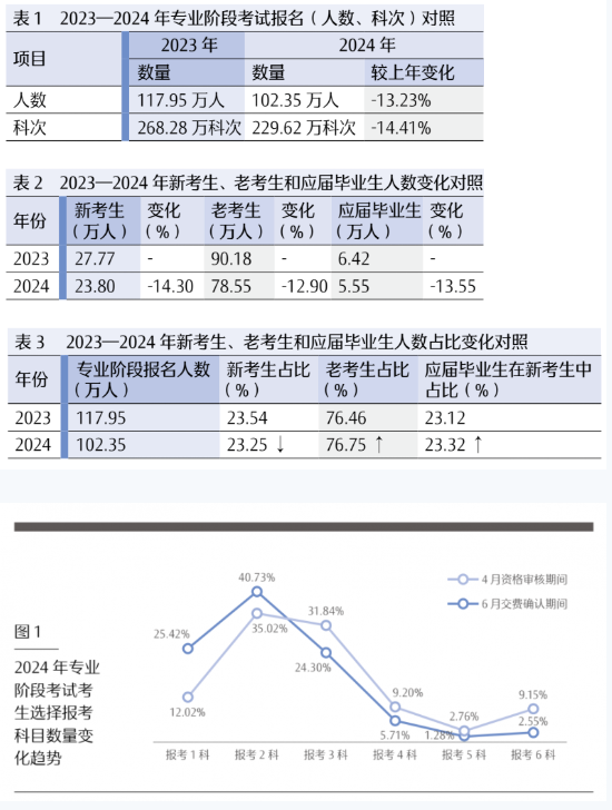 1.專業階段考試整體規模進一步下降。2024年最終通過資格審核并完成交費的人數為102.35萬人,涉及229.62萬科次,較2023年分別減少了13.23%和14.41%。詳見表1。