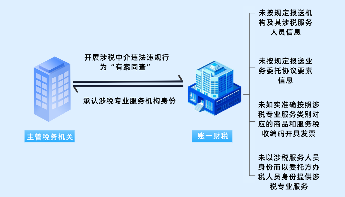 賬一財稅實際控制人面對稅務機關掌握的線索,承認其公司為涉稅專業服務機構,存在未按規定報送機構及其涉稅服務人員信息、未按規定報送業務委托協議要素信息、未如實準確按照涉稅專業服務類別對應的商品和服務稅收編碼開具發票、未以涉稅服務人員身份而以委托方辦稅人員身份提供涉稅專業服務等問題。
